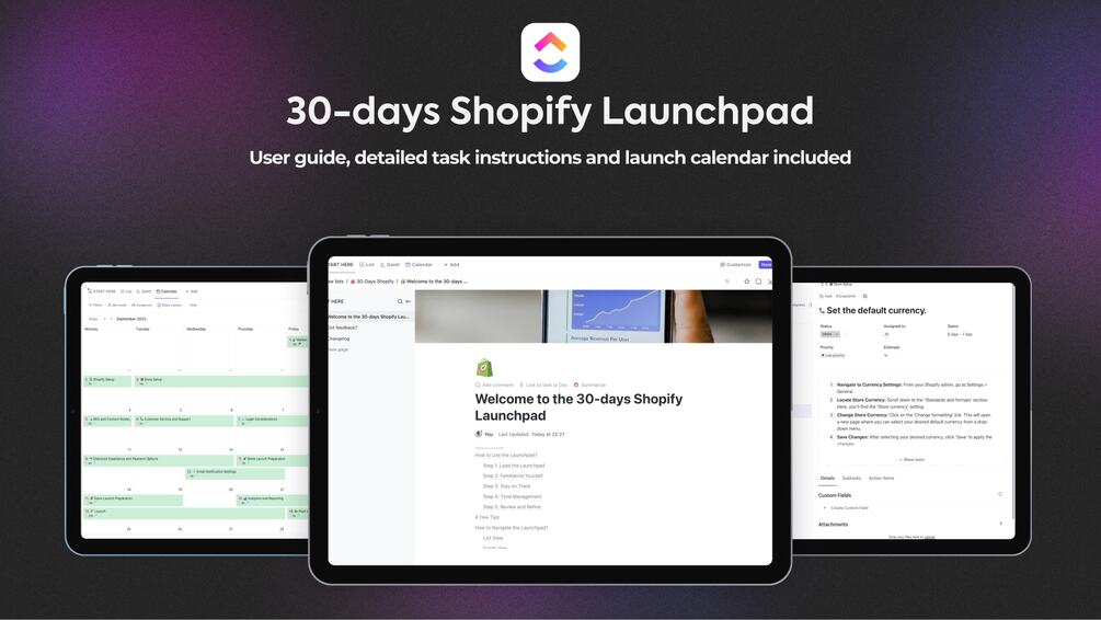 That's why we created the 30-Days Shopify Launchpad—an actionable, foolproof ClickUp template that guides you, step-by-step, to set up your Shopify store. It's your personal ecommerce compass, ensuring you never lose your way.